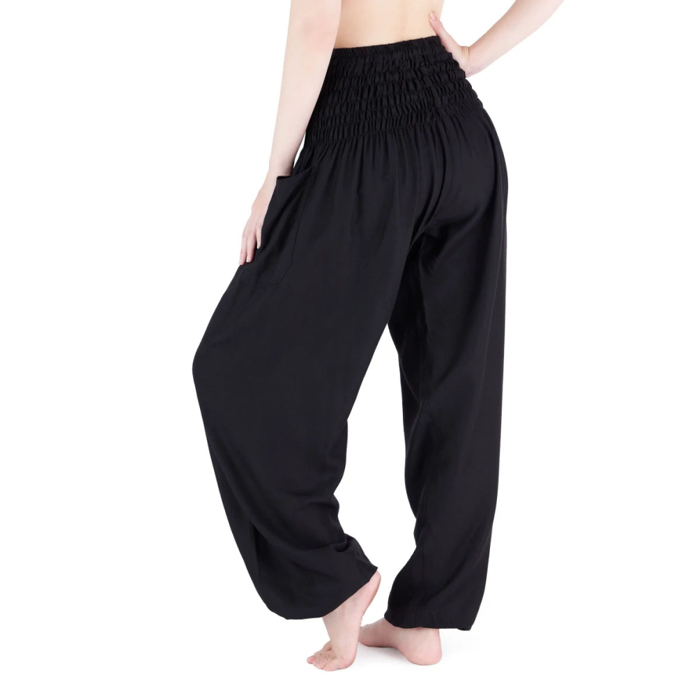 Zomerbroek voor dames en heren, met elastiek in de taille en rond de enkels en een zak op de heup.