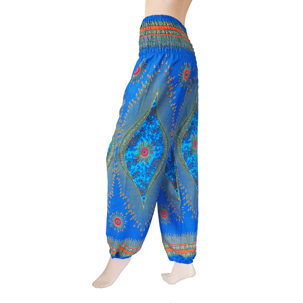 Zomerbroek met elastisch gesmokte tailleband, elastiek rond de enkels en een zak op de heup.