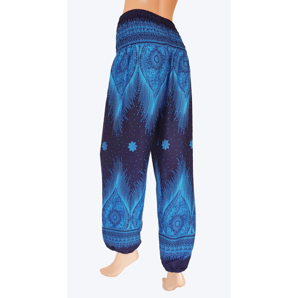 Zomerbroek met elastisch gesmokte tailleband, elastiek rond de enkels en een zak op de heup.