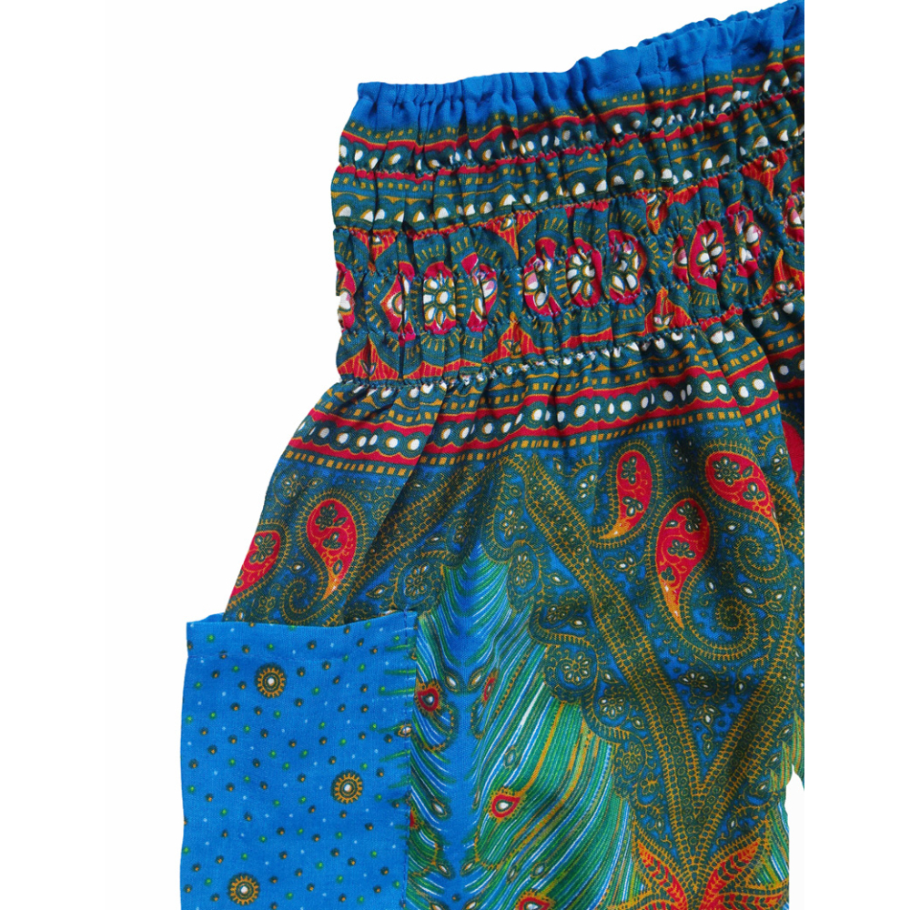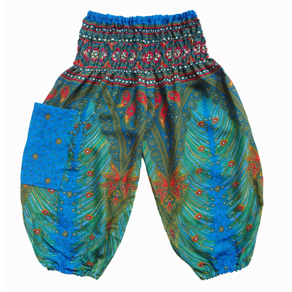 Schattige kinder zomerbroek met elastiek in de taille en rond de enkels en een zak op de heup.